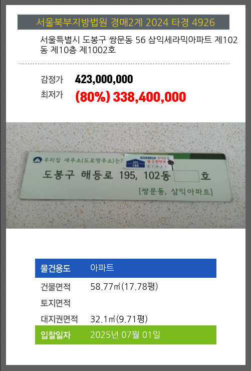 사건번호 2024 타경 4926 본건은 서울특별시 도봉구 쌍문동 56 삼익세라믹아파트 제102동 제10층 제1002호소재하는 아파트경매 물건의 포스팅입니다. 건물면적 [ 58.77㎡ (17.78평) ]대지권 [ 32.1㎡ (9.71평) ]