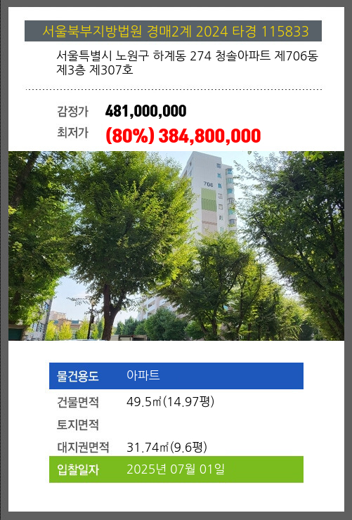사건번호 2024 타경 115833 본건은 서울특별시 노원구 하계동 274 청솔아파트 제706동 제3층 제307호소재하는 아파트경매 물건의 포스팅입니다. 건물면적 [ 49.5㎡ (14.97평) ]대지권 [ 31.74㎡ (9.6평) ]