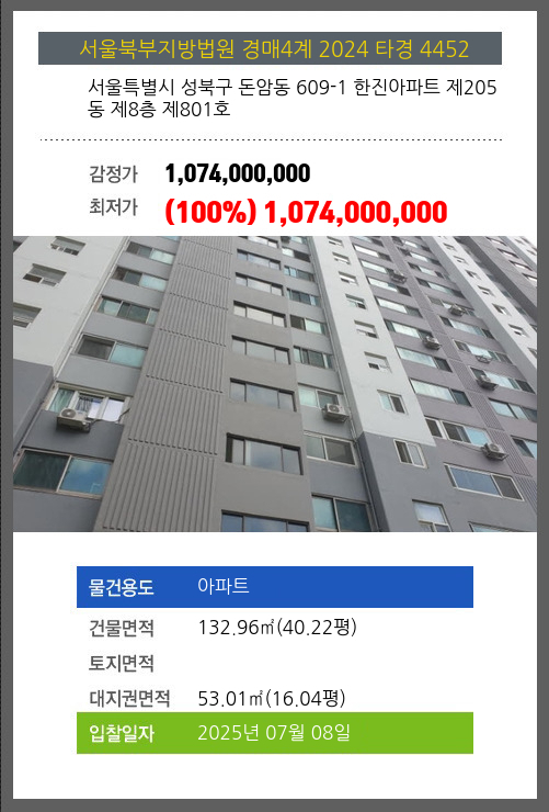 사건번호 2024 타경 4452 본건은 서울특별시 성북구 돈암동 609-1 한진아파트 제205동 제8층 제801호소재하는 아파트경매 물건의 포스팅입니다. 건물면적 [ 132.96㎡ (40.22평) ]대지권 [ 53.01㎡ (16.04평) ]