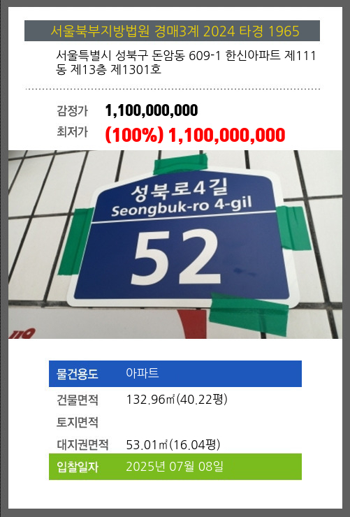 사건번호 2024 타경 1965 본건은 서울특별시 성북구 돈암동 609-1 한신아파트 제111동 제13층 제1301호소재하는 아파트경매 물건의 포스팅입니다. 건물면적 [ 132.96㎡ (40.22평) ]대지권 [ 53.01㎡ (16.04평) ]