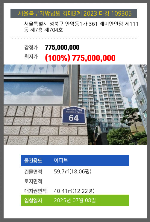 사건번호 2023 타경 109305 본건은 서울특별시 성북구 안암동1가 361 래미안안암 제111동 제7층 제704호소재하는 아파트경매 물건의 포스팅입니다. 건물면적 [ 59.7㎡ (18.06평) ]대지권 [ 40.41㎡ (12.22평) ]