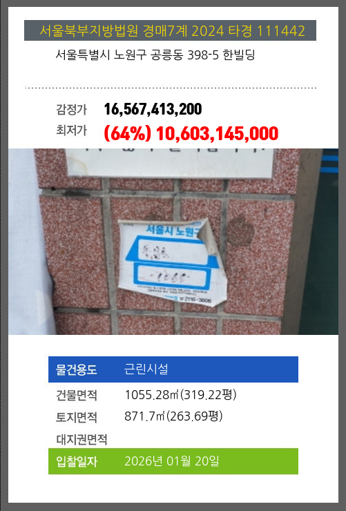 사건번호 2024 타경 111442 본건은 서울특별시 노원구 공릉동 398-5 한빌딩소재하는 근린시설경매 물건의 포스팅입니다. 시세를 반영한 감정가 16,567,413,200에서신건으로 감정가 대비 100%최저가 16,567,413,200부터입찰에 참여할 수 있습니다. 입찰보증금은