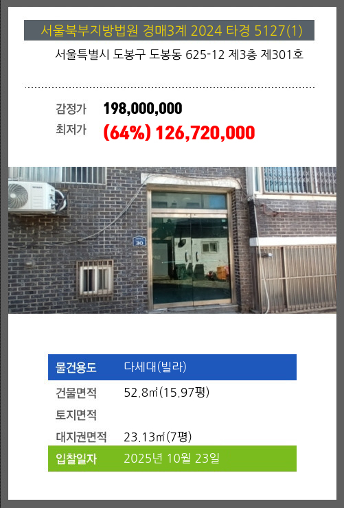 사건번호 2024 타경 5127(1) 본건은 서울특별시 도봉구 도봉동 625-12 제3층 제301호소재하는 다세대(빌라)경매 물건의 포스팅입니다. 건물면적 [ 52.8㎡ (15.97평) ]대지권 [ 23.13㎡ (7평) ] 시세를 반영한