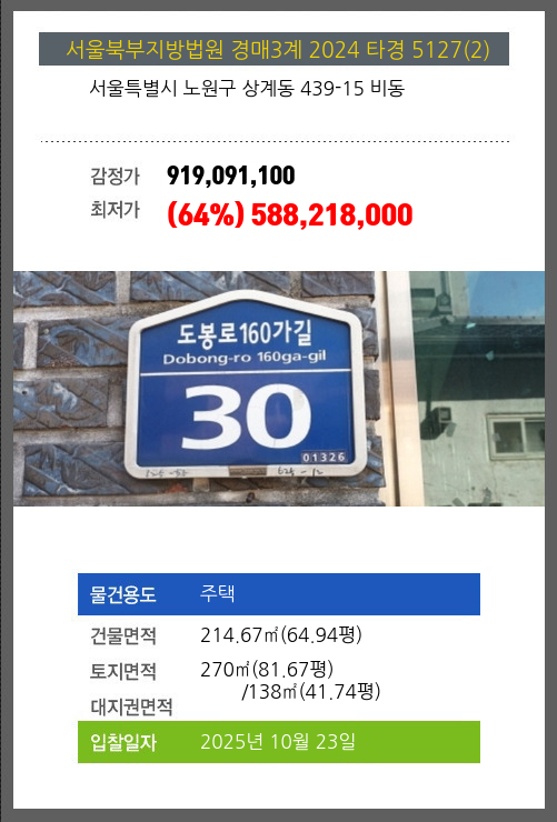 사건번호 2024 타경 5127(2) 본건은 서울특별시 노원구 상계동 439-15 비동소재하는 주택경매 물건의 포스팅입니다. 건물면적 [ 214.67㎡ (64.94평) ]토지면적 [ 전체:270㎡ (81.67평) 매각지분:138㎡ (41.74평) ] 시세를