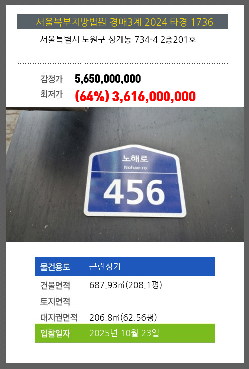 사건번호 2024 타경 1736 본건은 서울특별시 노원구 상계동 734-4 2층201호소재하는 근린상가경매 물건의 포스팅입니다. 건물면적 [ 687.93㎡ (208.1평) ]대지권 [ 206.8㎡ (62.56평) ] 시세를 반영한 감정가