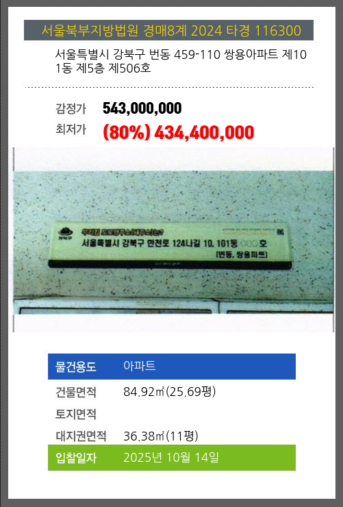 사건번호 2024 타경 116300 본건은 서울특별시 강북구 번동 459-110 쌍용아파트 제101동 제5층 제506호소재하는 아파트경매 물건의 포스팅입니다. 건물면적 [ 84.92㎡ (25.69평) ]대지권 [ 36.38㎡ (11평) ]