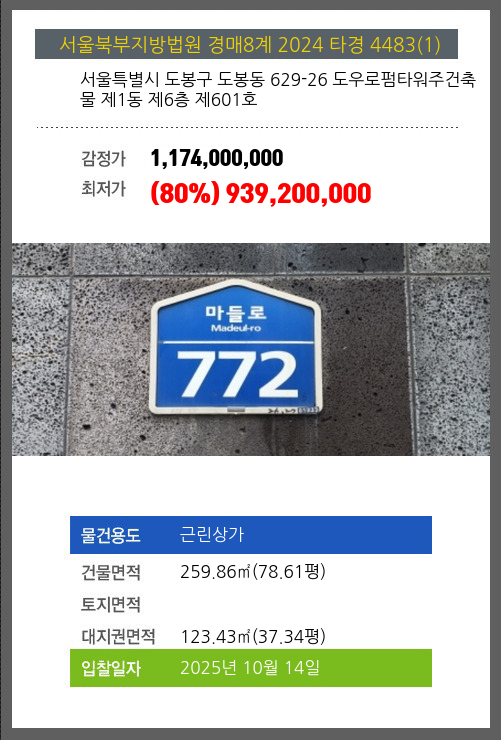사건번호 2024 타경 4483(1) 본건은 서울특별시 도봉구 도봉동 629-26 도우로펌타워주건축물 제1동 제6층 제601호소재하는 근린상가경매 물건의 포스팅입니다. 건물면적 [ 259.86㎡ (78.61평) ]대지권 [ 123.43㎡ (37.34평) ]