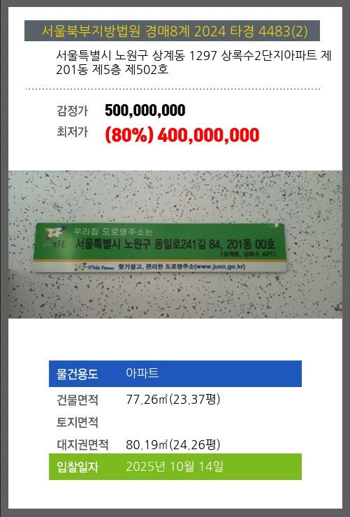 사건번호 2024 타경 4483(2) 본건은 서울특별시 노원구 상계동 1297 상록수2단지아파트 제201동 제5층 제502호소재하는 아파트경매 물건의 포스팅입니다. 건물면적 [ 77.26㎡ (23.37평) ]대지권 [ 80.19㎡ (24.26평) ]