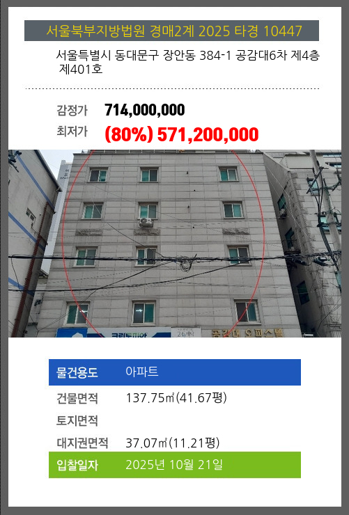 사건번호 2025 타경 10447 본건은 서울특별시 동대문구 장안동 384-1 공감대6차 제4층 제401호소재하는 아파트경매 물건의 포스팅입니다. 건물면적 [ 137.75㎡ (41.67평) ]대지권 [ 37.07㎡ (11.21평) ] 시세를