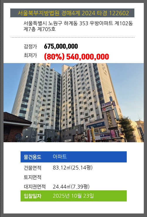 사건번호 2024 타경 122602 본건은 서울특별시 노원구 하계동 353 우방아파트 제102동 제7층 제705호소재하는 아파트경매 물건의 포스팅입니다. 건물면적 [ 83.12㎡ (25.14평) ]대지권 [ 24.44㎡ (7.39평) ]
