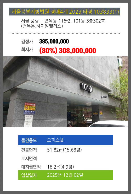 사건번호 2023 타경 103833(1) 본건은 서울 중랑구 면목동 116-2, 101동 3층302호 (면목동,하이원팰리스)소재하는 오피스텔경매 물건의 포스팅입니다. 건물면적 [ 51.82㎡ (15.68평) ]대지권 [ 16.2㎡ (4.9평) ] 시세를