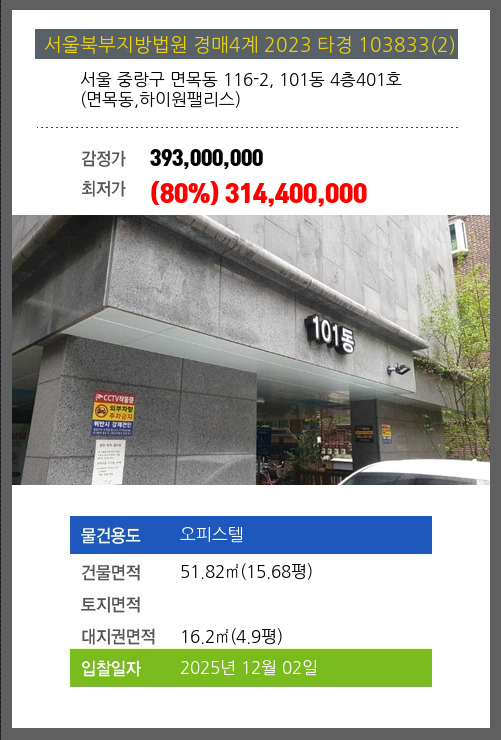 사건번호 2023 타경 103833(2) 본건은 서울 중랑구 면목동 116-2, 101동 4층401호 (면목동,하이원팰리스)소재하는 오피스텔경매 물건의 포스팅입니다. 건물면적 [ 51.82㎡ (15.68평) ]대지권 [ 16.2㎡ (4.9평) ] 시세를