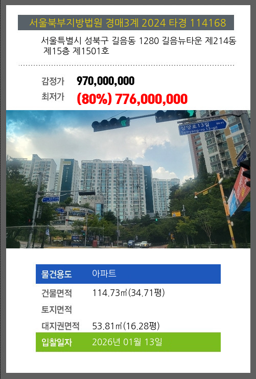 사건번호 2024 타경 114168 본건은 서울특별시 성북구 길음동 1280 길음뉴타운 제214동 제15층 제1501호소재하는 아파트경매 물건의 포스팅입니다. 건물면적 [ 114.73㎡ (34.71평) ]대지권 [ 53.81㎡ (16.28평) ]