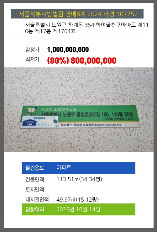 사건번호 2024 타경 107252 본건은 서울특별시 노원구 하계동 354 학여울청구아파트 제110동 제17층 제1704호소재하는 아파트경매 물건의 포스팅입니다. 건물면적 [ 113.51㎡ (34.34평) ]대지권 [ 49.97㎡ (15.12평) ]