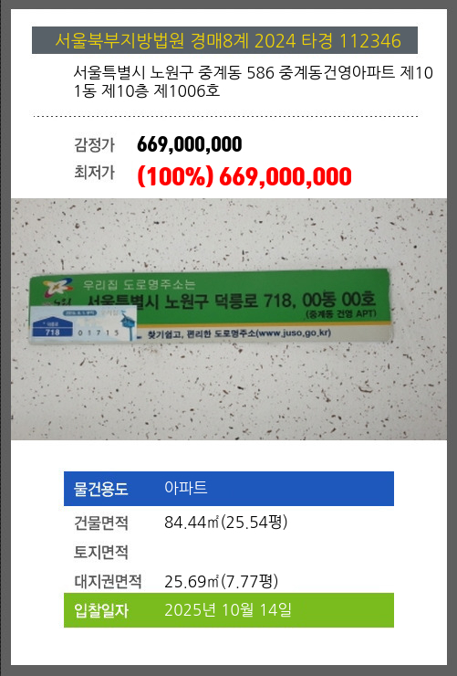 사건번호 2024 타경 112346 본건은 서울특별시 노원구 중계동 586 중계동건영아파트 제101동 제10층 제1006호소재하는 아파트경매 물건의 포스팅입니다. 건물면적 [ 84.44㎡ (25.54평) ]대지권 [ 25.69㎡ (7.77평) ]