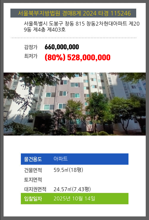 사건번호 2024 타경 115246 본건은 서울특별시 도봉구 창동 815 창동2차현대아파트 제209동 제4층 제403호소재하는 아파트경매 물건의 포스팅입니다. 건물면적 [ 59.5㎡ (18평) ]대지권 [ 24.57㎡ (7.43평) ]