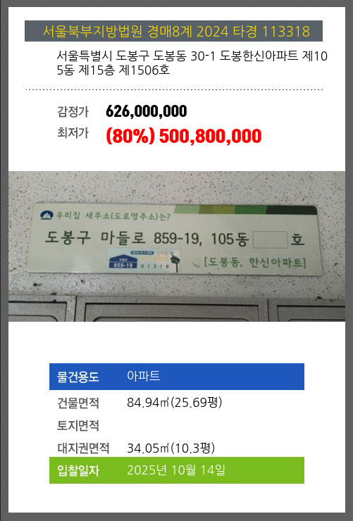 사건번호 2024 타경 113318 본건은 서울특별시 도봉구 도봉동 30-1 도봉한신아파트 제105동 제15층 제1506호소재하는 아파트경매 물건의 포스팅입니다. 건물면적 [ 84.94㎡ (25.69평) ]대지권 [ 34.05㎡ (10.3평) ]