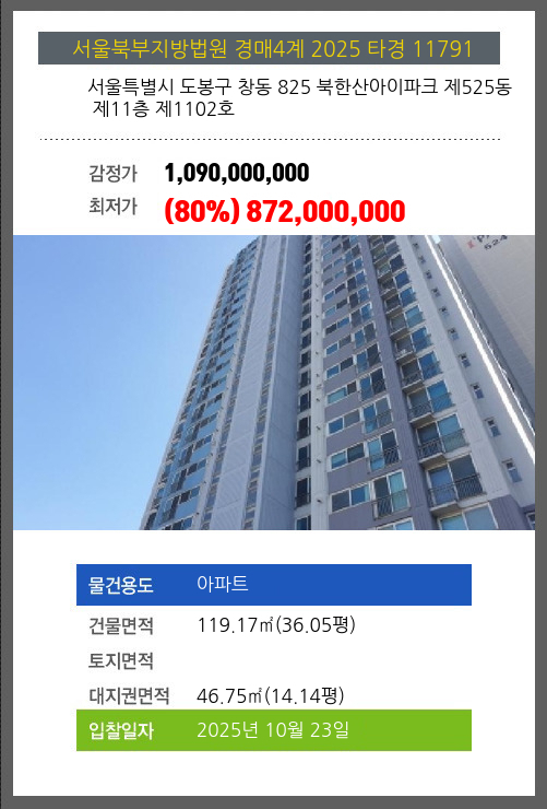 사건번호 2025 타경 11791 본건은 서울특별시 도봉구 창동 825 북한산아이파크 제525동 제11층 제1102호소재하는 아파트경매 물건의 포스팅입니다. 건물면적 [ 119.17㎡ (36.05평) ]대지권 [ 46.75㎡ (14.14평) ]
