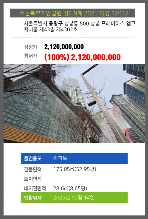 사건번호 2025 타경 12037 본건은 서울특별시 중랑구 상봉동 500 상봉 프레미어스 엠코 제비동 제43층 제4302호소재하는 아파트경매 물건의 포스팅입니다. 건물면적 [ 175.05㎡ (52.95평) ]대지권 [ 28.6㎡