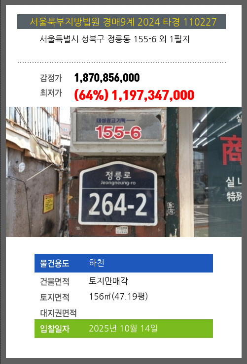 사건번호 2024 타경 110227 본건은 서울특별시 성북구 정릉동 155-6 외 1필지소재하는 하천경매 물건의 포스팅입니다. 건물면적 [ 토지만매각 ]토지면적 [ 156㎡ (47.19평) ] 시세를 반영한 감정가