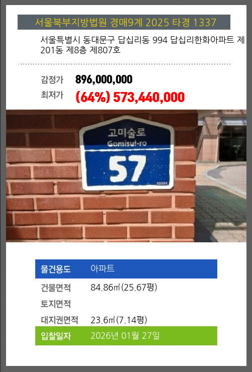 사건번호 2025 타경 1337 본건은 서울특별시 동대문구 답십리동 994 답십리한화아파트 제201동 제8층 제807호소재하는 아파트경매 물건의 포스팅입니다. 건물면적 [ 84.86㎡ (25.67평) ]대지권 [ 23.6㎡ (7.14평) ]