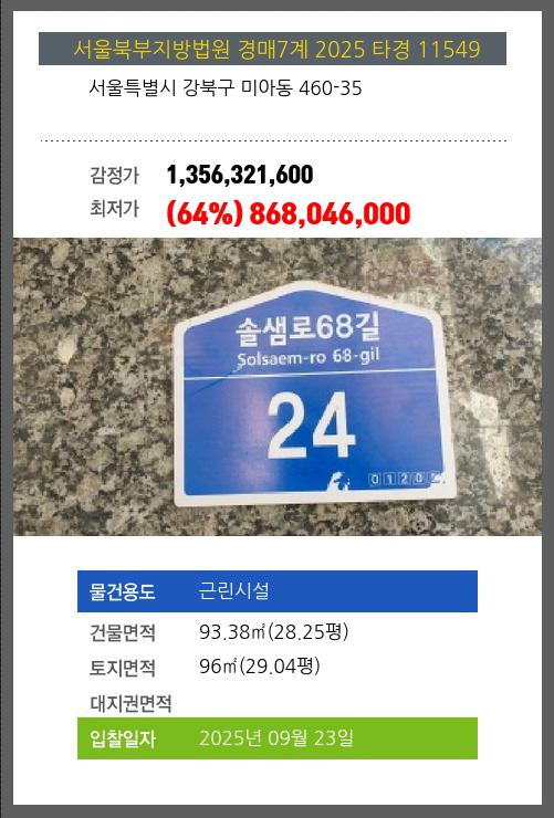 사건번호 2025 타경 11549 본건은 서울특별시 강북구 미아동 460-35소재하는 근린시설경매 물건의 포스팅입니다. 건물면적 [ 93.38㎡ (28.25평) ]토지면적 [ 96㎡ (29.04평) ] 시세를 반영한 감정가 1,356,321,600에서2회