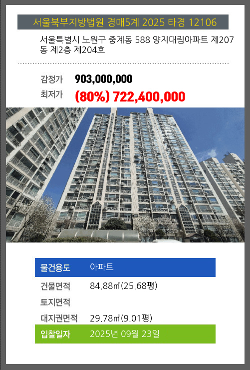사건번호 2025 타경 12106 본건은 서울특별시 노원구 중계동 588 양지대림아파트 제207동 제2층 제204호소재하는 아파트경매 물건의 포스팅입니다. 건물면적 [ 84.88㎡ (25.68평) ]대지권 [ 29.78㎡ (9.01평) ]