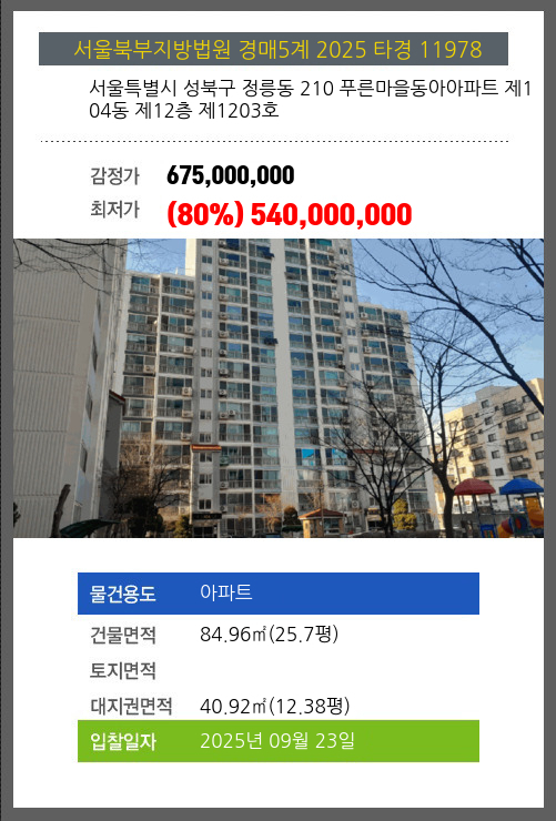 사건번호 2025 타경 11978 본건은 서울특별시 성북구 정릉동 210 푸른마을동아아파트 제104동 제12층 제1203호소재하는 아파트경매 물건의 포스팅입니다. 건물면적 [ 84.96㎡ (25.7평) ]대지권 [ 40.92㎡ (12.38평) ]
