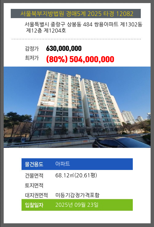 사건번호 2025 타경 12082 본건은 서울특별시 중랑구 상봉동 484 쌍용아파트 제1302동 제12층 제1204호소재하는 아파트경매 물건의 포스팅입니다. 건물면적 [ 68.12㎡ (20.61평) ]대지권 [ 미등기감정가격포함 ] 시세를