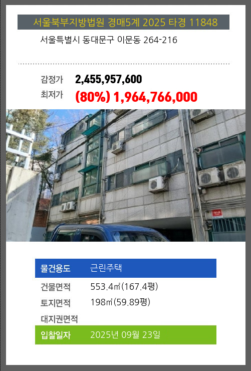 사건번호 2025 타경 11848 본건은 서울특별시 동대문구 이문동 264-216소재하는 근린주택경매 물건의 포스팅입니다. 건물면적 [ 553.4㎡ (167.4평) ]토지면적 [ 198㎡ (59.89평) ] 시세를 반영한 감정가 2,455,957,600에서1회