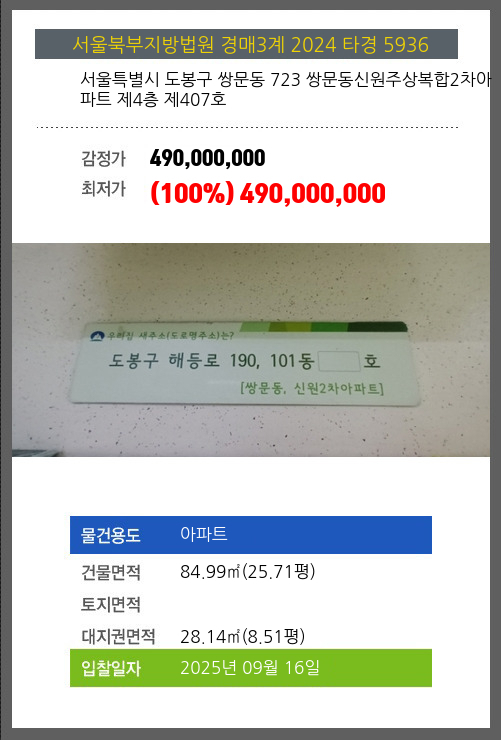 사건번호 2024 타경 5936 본건은 서울특별시 도봉구 쌍문동 723 쌍문동신원주상복합2차아파트 제4층 제407호소재하는 아파트경매 물건의 포스팅입니다. 건물면적 [ 84.99㎡ (25.71평) ]대지권 [ 28.14㎡ (8.51평) ] 시세를