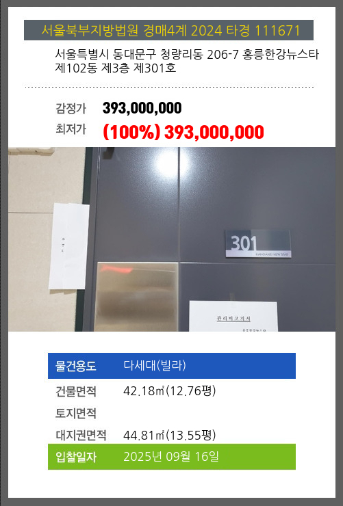 사건번호 2024 타경 111671 본건은 서울특별시 동대문구 청량리동 206-7 홍릉한강뉴스타 제102동 제3층 제301호소재하는 다세대(빌라)경매 물건의 포스팅입니다. 건물면적 [ 42.18㎡ (12.76평) ]대지권 [ 44.81㎡ (13.55평) ]