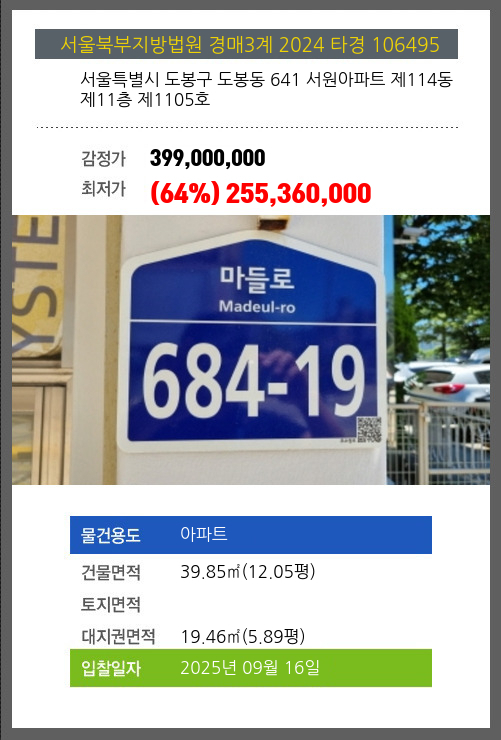 사건번호 2024 타경 106495 본건은 서울특별시 도봉구 도봉동 641 서원아파트 제114동 제11층 제1105호소재하는 아파트경매 물건의 포스팅입니다. 건물면적 [ 39.85㎡ (12.05평) ]대지권 [ 19.46㎡ (5.89평) ]