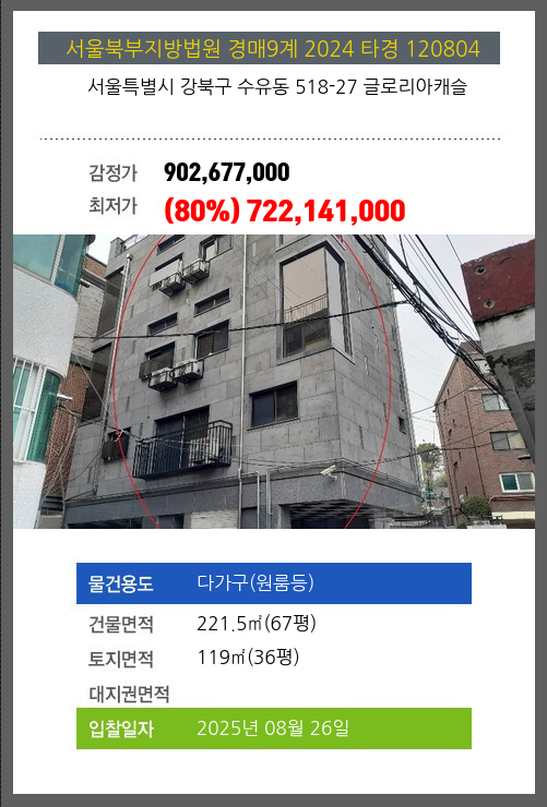 사건번호 2024 타경 120804 본건은 서울특별시 강북구 수유동 518-27 글로리아캐슬소재하는 다가구(원룸등)경매 물건의 포스팅입니다. 건물면적 [ 221.5㎡ (67평) ]토지면적 [ 119㎡ (36평) ] 시세를 반영한 감정가