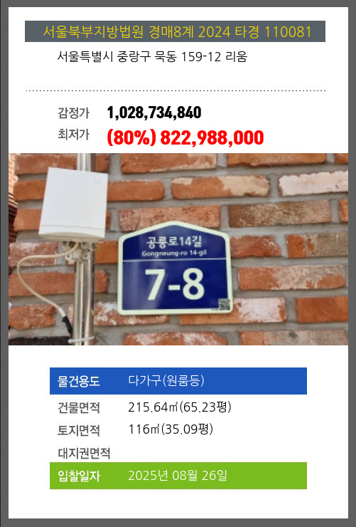 사건번호 2024 타경 110081 본건은 서울특별시 중랑구 묵동 159-12 리움소재하는 다가구(원룸등)경매 물건의 포스팅입니다. 건물면적 [ 215.64㎡ (65.23평) ]토지면적 [ 116㎡ (35.09평) ] 시세를 반영한 감정가
