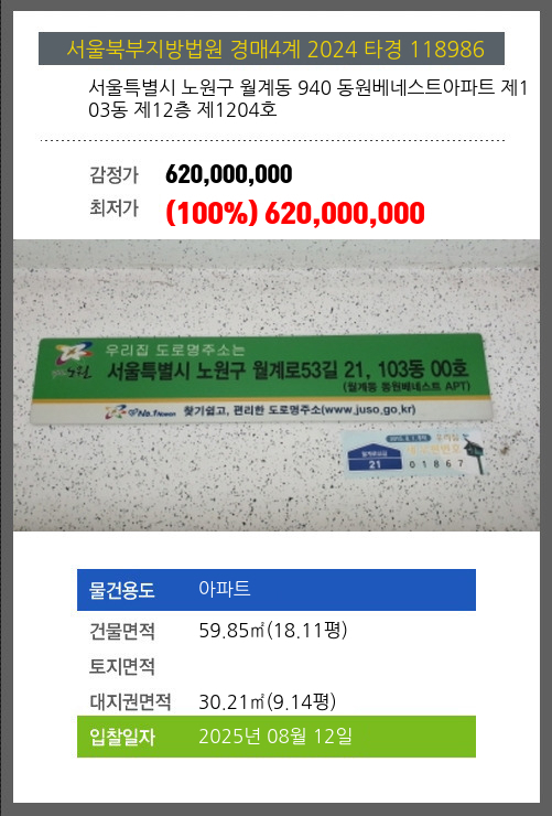 사건번호 2024 타경 118986 본건은 서울특별시 노원구 월계동 940 동원베네스트아파트 제103동 제12층 제1204호소재하는 아파트경매 물건의 포스팅입니다. 건물면적 [ 59.85㎡ (18.11평) ]대지권 [ 30.21㎡ (9.14평) ]
