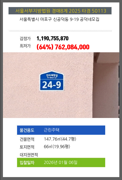 사건번호 2025 타경 50113 본건은 서울특별시 마포구 신공덕동 9-19 공덕네모집소재하는 근린주택경매 물건의 포스팅입니다. 건물면적 [ 147.76㎡ (44.7평) ]토지면적 [ 66㎡ (19.96평) ] 시세를 반영한 감정가
