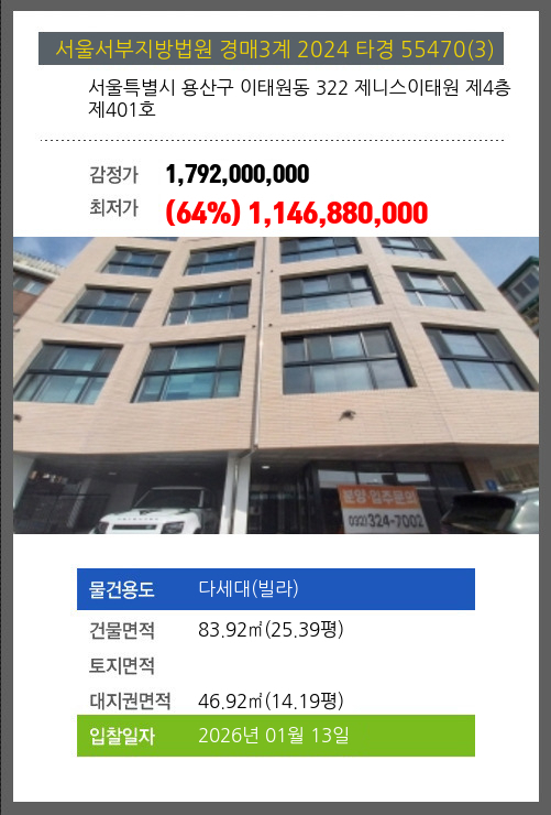 사건번호 2024 타경 55470(3) 본건은 서울특별시 용산구 이태원동 322 제니스이태원 제4층 제401호소재하는 다세대(빌라)경매 물건의 포스팅입니다. 건물면적 [ 83.92㎡ (25.39평) ]대지권 [ 46.92㎡ (14.19평) ] 시세를