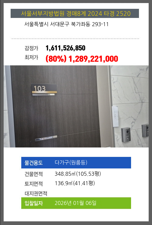 사건번호 2024 타경 2520 본건은 서울특별시 서대문구 북가좌동 293-11소재하는 다가구(원룸등)경매 물건의 포스팅입니다. 건물면적 [ 348.85㎡ (105.53평) ]토지면적 [ 136.9㎡ (41.41평) ] 시세를 반영한 감정가 1,611,526,850에서1회