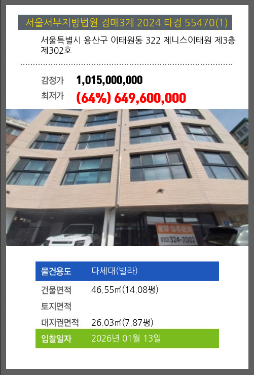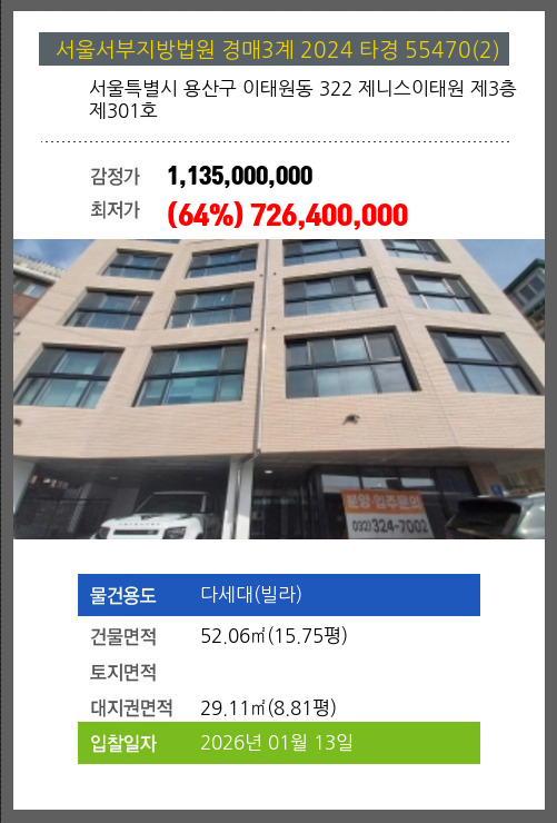사건번호 2024 타경 55470(2) 본건은 서울특별시 용산구 이태원동 322 제니스이태원 제3층 제301호소재하는 다세대(빌라)경매 물건의 포스팅입니다. 건물면적 [ 52.06㎡ (15.75평) ]대지권 [ 29.11㎡ (8.81평) ] 시세를