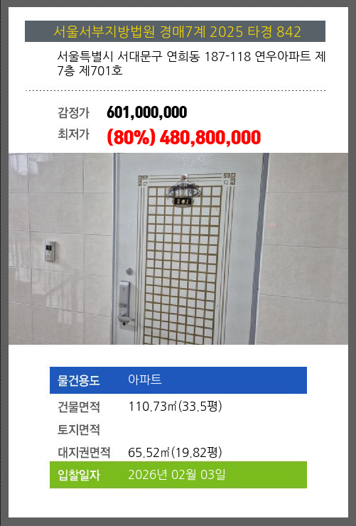 사건번호 2025 타경 842 본건은 서울특별시 서대문구 연희동 187-118 연우아파트 제7층 제701호소재하는 아파트경매 물건의 포스팅입니다. 건물면적 [ 110.73㎡ (33.5평) ]대지권 [ 65.52㎡ (19.82평) ] 시세를