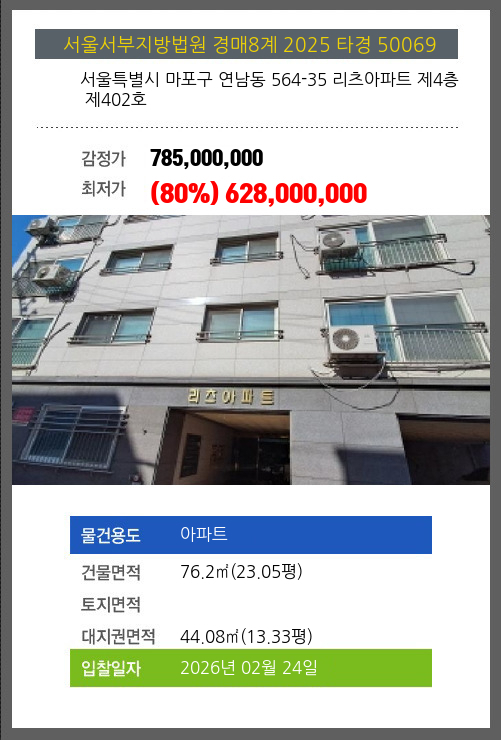 사건번호 2025 타경 50069 본건은 서울특별시 마포구 연남동 564-35 리츠아파트 제4층 제402호소재하는 아파트경매 물건의 포스팅입니다. 건물면적 [ 76.2㎡ (23.05평) ]대지권 [ 44.08㎡ (13.33평) ] 시세를