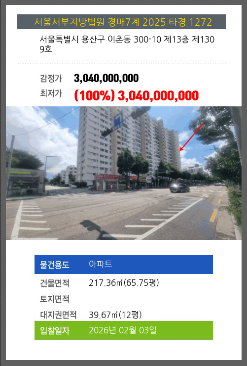 사건번호 2025 타경 1272 본건은 서울특별시 용산구 이촌동 300-10 제13층 제1309호소재하는 아파트경매 물건의 포스팅입니다. 건물면적 [ 217.36㎡ (65.75평) ]대지권 [ 39.67㎡ (12평) ] 시세를 반영한