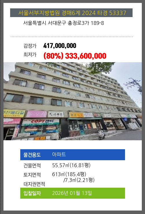 사건번호 2024 타경 53337 본건은 서울특별시 서대문구 충정로3가 189-8소재하는 아파트경매 물건의 포스팅입니다. 건물면적 [ 55.57㎡ (16.81평) ]토지면적 [ 전체:613㎡ (185.4평) 매각지분:7.3㎡ (2.21평) ] 시세를 반영한