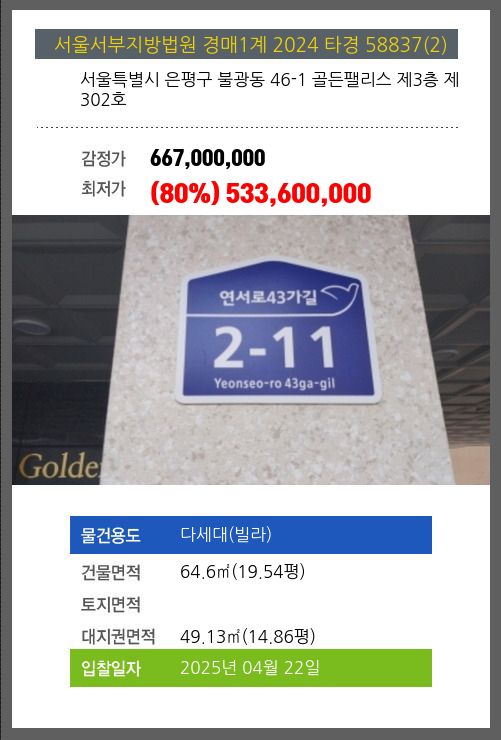 사건번호 2024 타경 58837(2) 본건은 서울특별시 은평구 불광동 46-1 골든팰리스 제3층 제302호소재하는 다세대(빌라)경매 물건의 포스팅입니다. 건물면적 [ 64.6㎡ (19.54평) ]대지권 [ 49.13㎡ (14.86평) ] 시세를