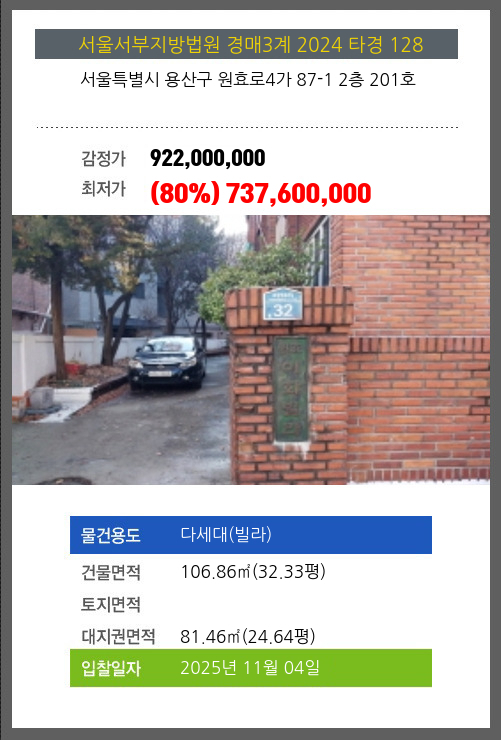 사건번호 2024 타경 128 본건은 서울특별시 용산구 원효로4가 87-1 2층 201호소재하는 다세대(빌라)경매 물건의 포스팅입니다. 건물면적 [ 106.86㎡ (32.33평) ]대지권 [ 81.46㎡ (24.64평) ] 시세를 반영한