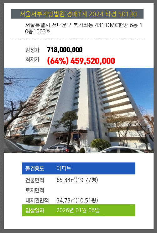사건번호 2024 타경 50130 본건은 서울특별시 서대문구 북가좌동 431 DMC한양 6동 10층1003호소재하는 아파트경매 물건의 포스팅입니다. 건물면적 [ 65.34㎡ (19.77평) ]대지권 [ 34.73㎡ (10.51평) ] 시세를