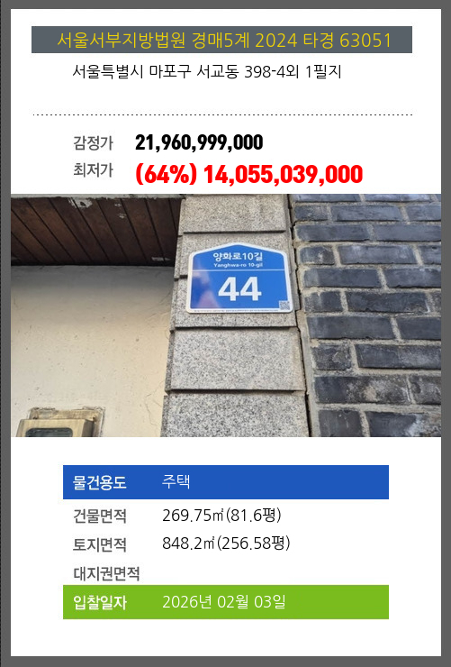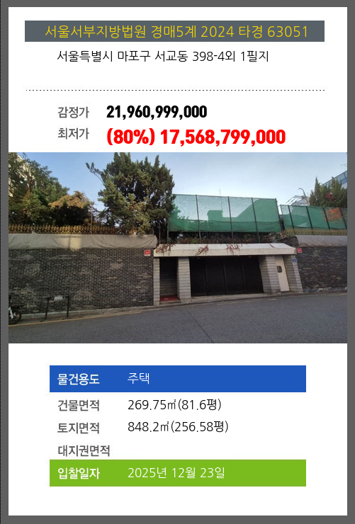 사건번호 2024 타경 63051 본건은 서울특별시 마포구 서교동 398-4외 1필지소재하는 주택경매 물건의 포스팅입니다. 건물면적 [ 269.75㎡ (81.6평) ]토지면적 [ 848.2㎡ (256.58평) ] 시세를 반영한 감정가
