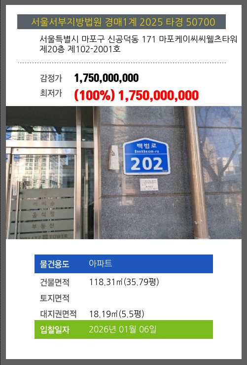 사건번호 2025 타경 50700 본건은 서울특별시 마포구 신공덕동 171 마포케이씨씨웰츠타워 제20층 제102-2001호소재하는 아파트경매 물건의 포스팅입니다. 건물면적 [ 118.31㎡ (35.79평) ]대지권 [ 18.19㎡ (5.5평) ] 시세를