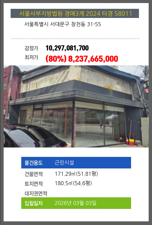 사건번호 2024 타경 58011 본건은 서울특별시 서대문구 창천동 31-55소재하는 근린시설경매 물건의 포스팅입니다. 건물면적 [ 171.29㎡ (51.81평) ]토지면적 [ 180.5㎡ (54.6평) ] 시세를 반영한 감정가 10,297,081,700에서1회